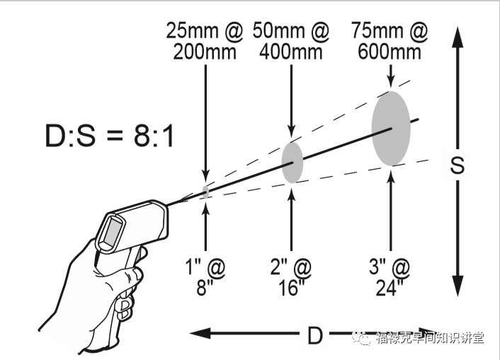 距離系數(shù)比(D:S)中的D指的是紅外測溫儀到被測目標(biāo)的距離,S指的是被測目標(biāo)區(qū)域(光斑)的最大直徑。