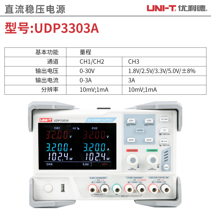輸出電壓:0-30V;輸出電流:0-3A;分辨率:10mv;1mA