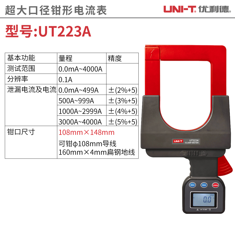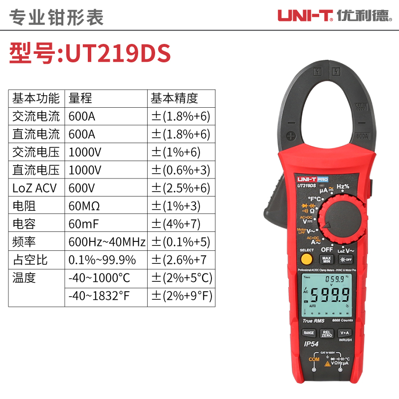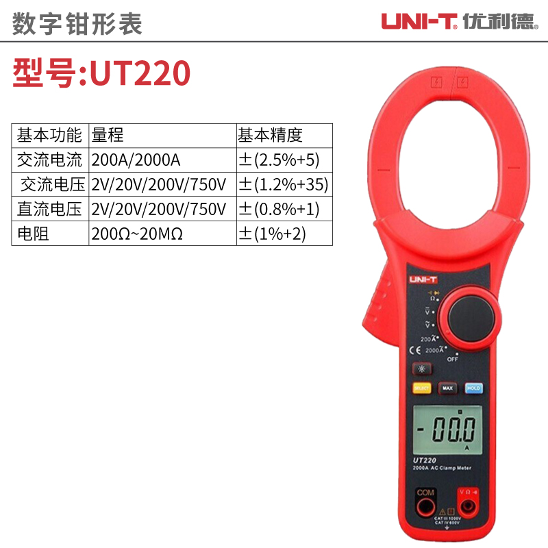 交直電流:40A~1000A;交直電壓:400mV-600V;電阻400Ω~40MΩ;最大顯...
