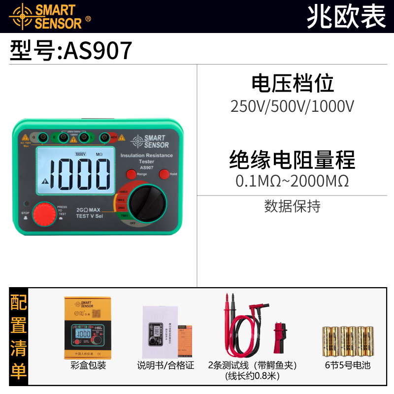 單量程 測試電壓1000 V (2000 MΩ) AC 電壓測量 超亮的LED照明刻度盤...