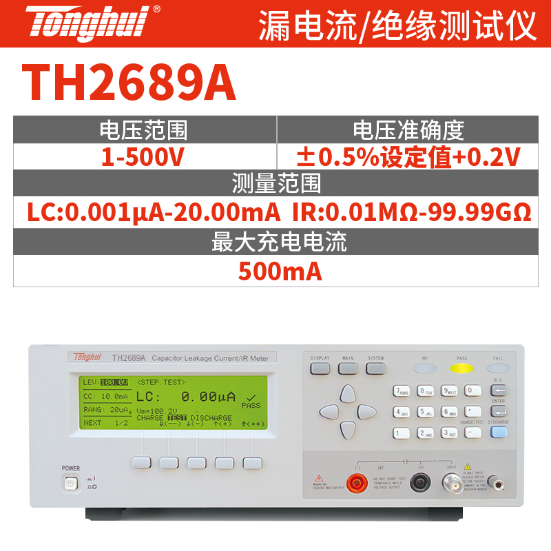 TH2689A型電容器漏電流/絕緣電阻測試儀分別提供最大測試電壓:500V,充...