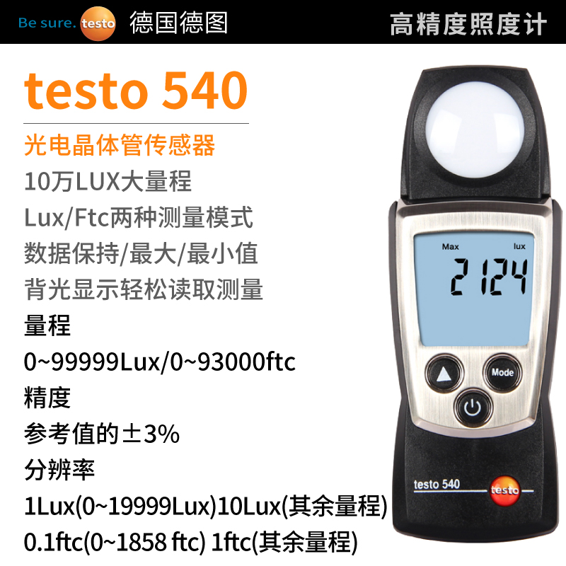 testo 540 照度計用于測量人造光和自然光,并為您提供快速簡便的方法來測量...