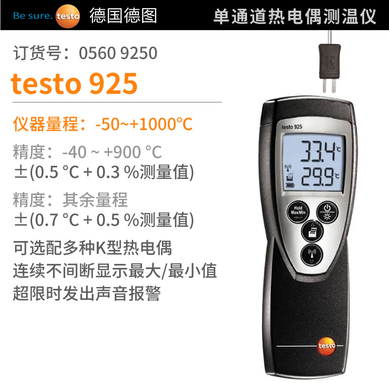 testo 925 單通道熱電偶測溫儀應(yīng)用廣泛,適用于各種溫度測量應(yīng)用。無論是表...