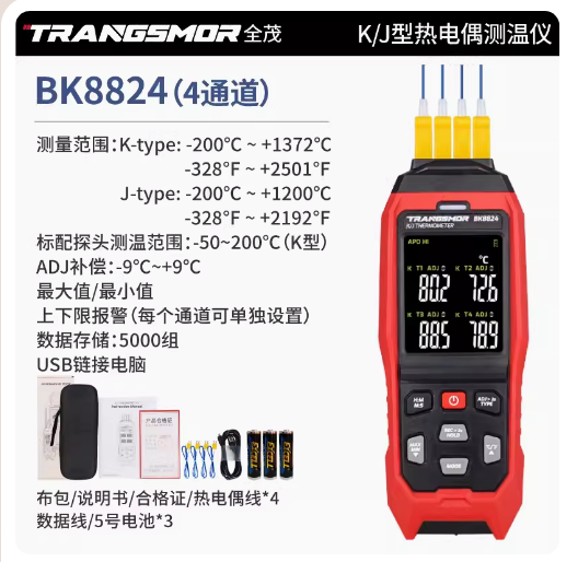 熱電偶測溫儀BK8824檢測器k型工業(yè)接觸式多通道電子溫度計(jì)帶探頭...