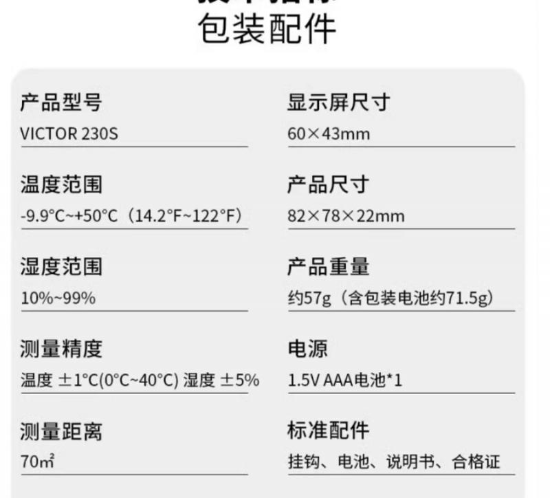 VICTOR 230S是一款可以實時監測室內空氣溫濕度的數字溫濕度計,其采用高精度溫濕度傳感器,搭載大屏幕數字顯示,集合日期、時間、溫度、濕度功能于一身,且可通過顯示屏上的表情變化直觀了解空氣濕度舒適度,可掛可立,環保耐用,能輕松滿足多種場景的使用需求。