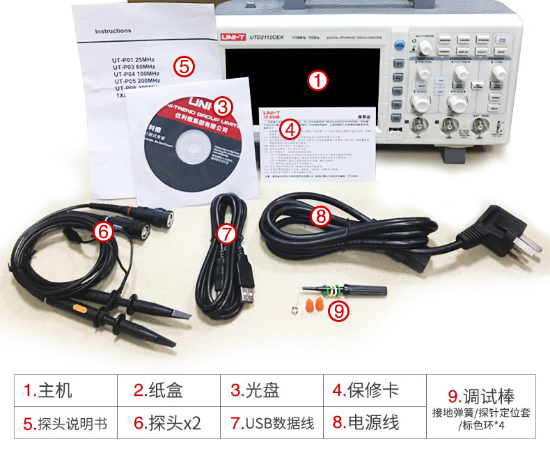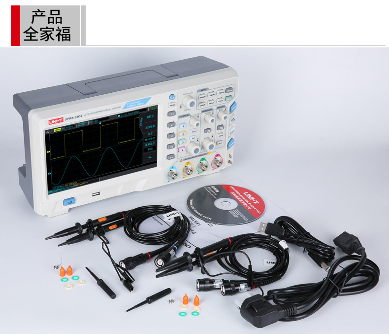 探頭×2(1:1,10:1可切換)、電源線、USB連接線、軟件光盤 |
