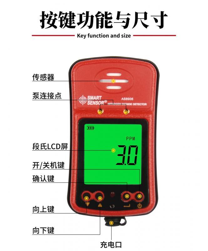 產品簡介 本儀器是一款便攜式二氧化氮(NO2)檢測儀,檢測到二氧化氮時,二氧化氮濃度讀數會顯示在液晶顯示屏上。儀器提供用星4的報警設定值,儀器便以聲、光及掀測結果超出預先設置的報警設定值,儀器便以聲、光及振動報警提醒用戶。
