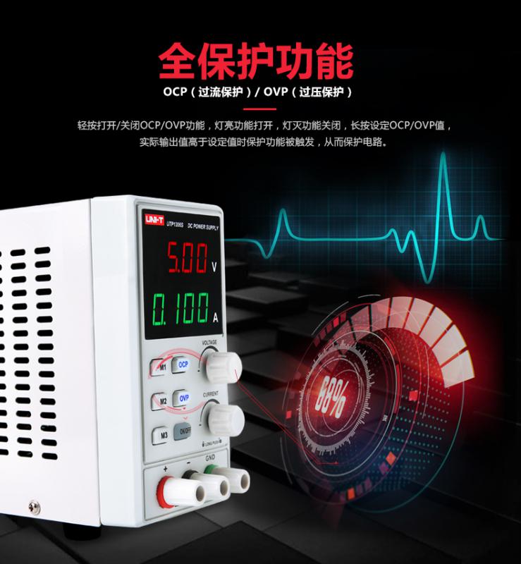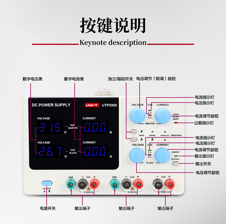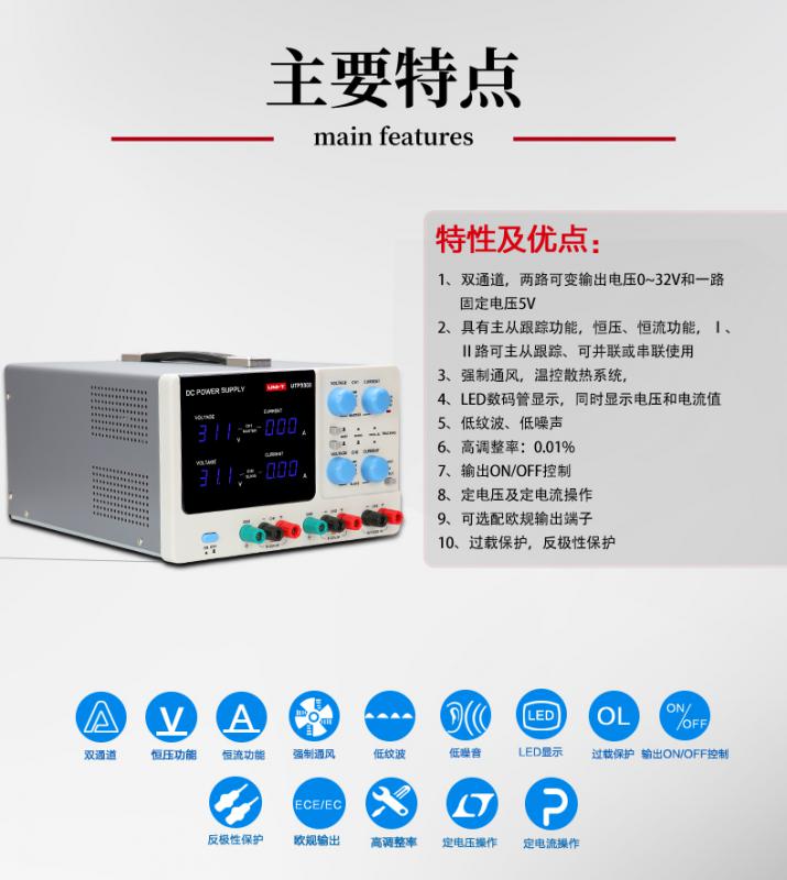 1、雙通道,兩路可變輸出電壓0~32V和一路固定電壓5V