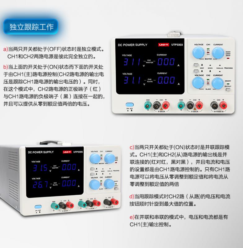 2、具有主從跟蹤功能,恒壓、恒流功能,Ⅰ、Ⅱ路可主從跟蹤、可并聯或串聯使用