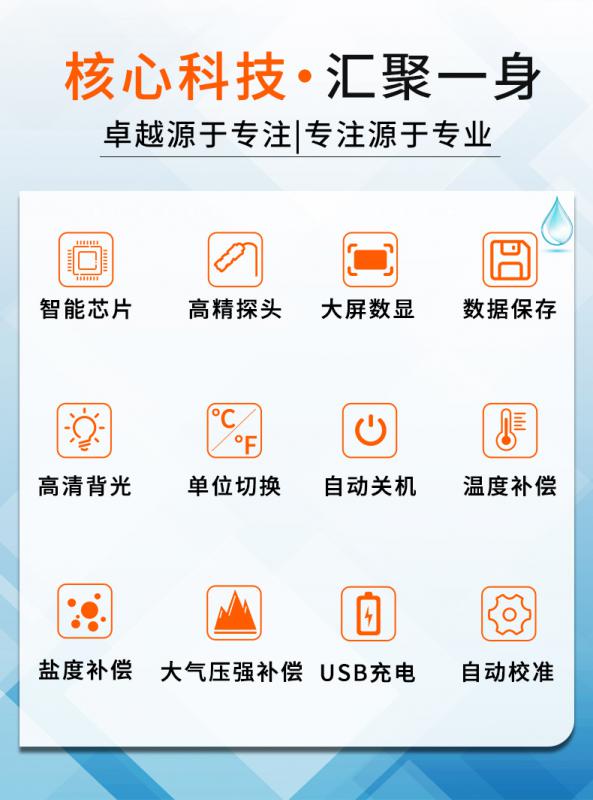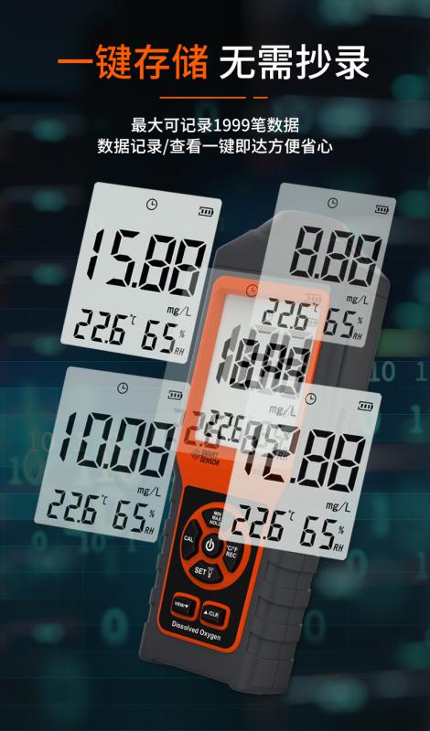 2. 智能操作設(shè)計(jì) 大屏液晶顯示,支持多參數(shù)同屏(DO、溫度、濕度等)。 一鍵校準(zhǔn)、自動(dòng)鹽度補(bǔ)償、數(shù)據(jù)存儲(chǔ)(1999 組)及歷史記錄查詢功能。