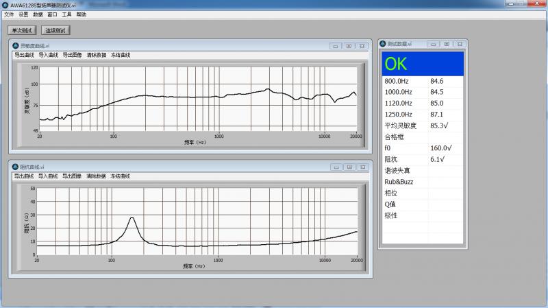 概述:AWA6128S 型揚(yáng)聲器測(cè)試儀執(zhí)行《GB/T 12060.5聲系統(tǒng)設(shè)備:揚(yáng)聲器主要性能測(cè)試方法》(IEC60268-5)標(biāo)準(zhǔn)。該儀器由測(cè)量分析電路, PC機(jī)和的分析軟件組成,功能強(qiáng)大,操作便捷。充分降低初期成本的投入和維護(hù)費(fèi)用,具有高效、強(qiáng)大的分析和處理能力。能快速地完成電聲產(chǎn)品揚(yáng)聲器的測(cè)試,是基于生產(chǎn)線和質(zhì)量控制(QC)、操作簡(jiǎn)易的要求而開發(fā)的測(cè)試系統(tǒng)。它將功率放大模塊,聲音測(cè)量模塊集成在一臺(tái)主機(jī)里,免去了用戶連線的煩惱。儀器可以同時(shí)測(cè)量揚(yáng)聲器頻響、阻抗、諧波失真、極性、異音等參數(shù)。根據(jù)設(shè)定的門限判斷揚(yáng)聲器合格品或不合格品。測(cè)試結(jié)束后,簡(jiǎn)潔直觀的顯示出PASS/FAIL,極大的提高了測(cè)試效率。