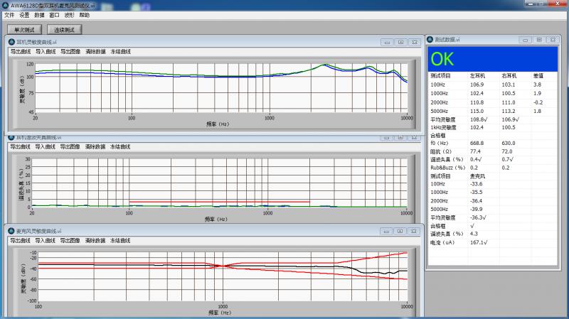 該儀器由電聲測試儀(4通道)主機、耳模擬器或聲耦合腔、仿真口、聲控測試傳聲器、測試架和專用的分析軟件組成。能同時快速準確地測量雙耳機的靈敏度及差值、頻響曲線、阻抗、諧波失真、極性和麥克風的靈敏度、頻響曲線、電流和特性電壓等電聲性能。根據設定的門限自動判斷耳機和麥克風合格品或不合格品。測試結束后,簡潔直觀的顯示出 OK/NG,極大的提高了測試效率。