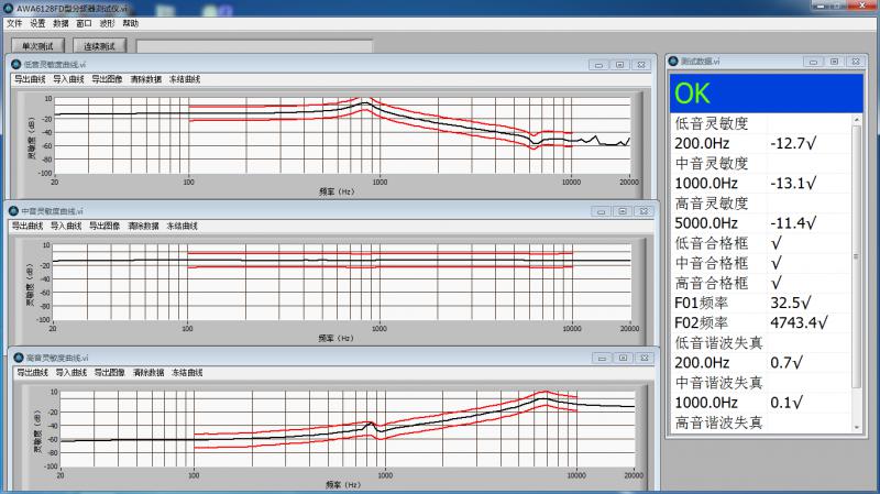 AWA6128FD型分頻器測試儀可以同時測量三分頻的高通(高頻)、帶通(中頻)、低通(低頻)的靈敏度曲線。也可以同時測量二分頻的高通、低通的靈敏度曲線。每個通道靈敏度曲線均可以單獨(dú)設(shè)置合格框,軟件根據(jù)每個通道的靈敏度曲線合格框給出判定結(jié)果。