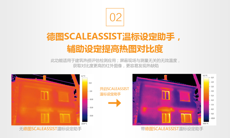 testo 865熱像儀采用專業的熱成像技術,并聚焦承包商日常工作所需的功能,它采用了用戶友好的設計,是確保快速和高效工作的理想選擇。借助德圖的 ScaleAssist溫標設定助手功能,可以確保建筑熱成像的刻度獲得合適設置,而IFOV警示器功能則可以讓您避免測量誤差,始終能夠生成完美的紅外圖像。