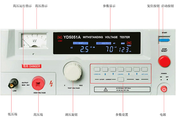 性能特點 1、高亮度熒光屏顯示 2、按鍵鎖防止誤操作 3、漏電流上下限設定和判定 4、模擬電壓表、數字電壓表雙路顯示 5、配備 PLC 和 RS232C 接口 6、聯鎖功能,和外部設備聯動切斷輸出