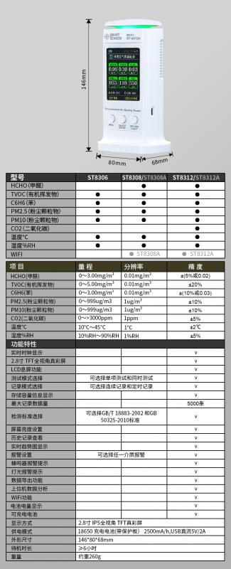 | TVCO有機揮發物 | 0~5.00mg/m3? ??分辨率:0.01mg/m3? ? ?精度:±20% |