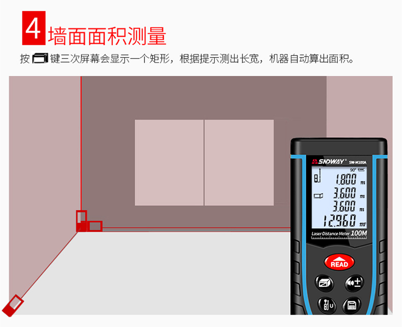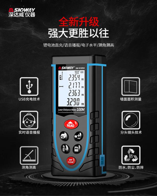 特點:M系列升級款測距儀可鋰電直充,真人語音指引測量,內置電子角度傳感器,輕松測量直線/角度/水平/垂直四項數據,30組數據存儲,多種測量模式,滿足日常測量需求