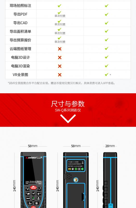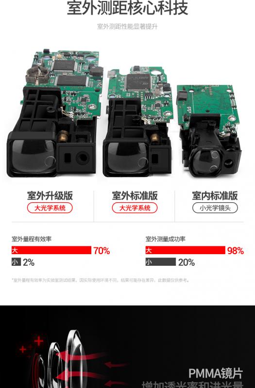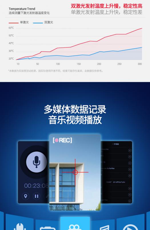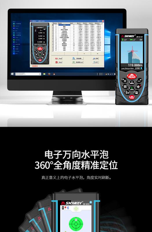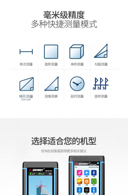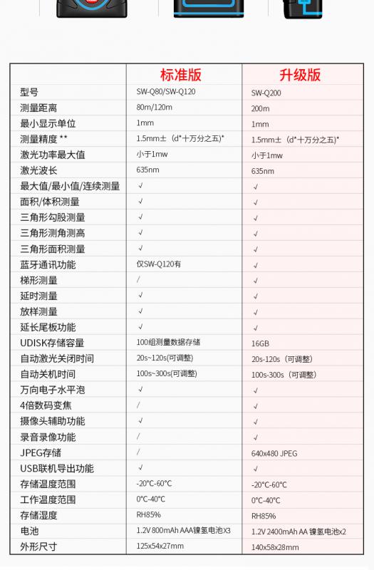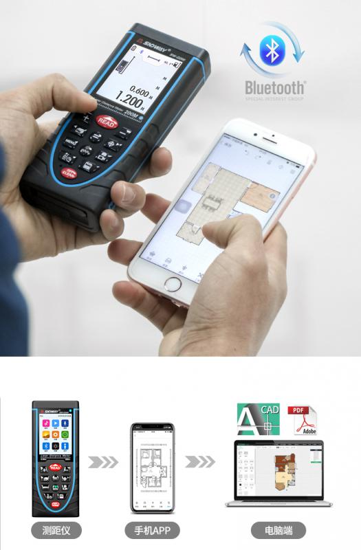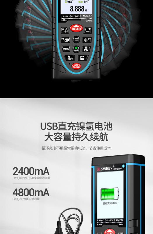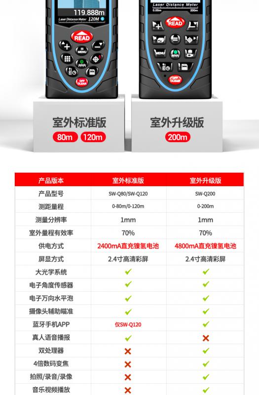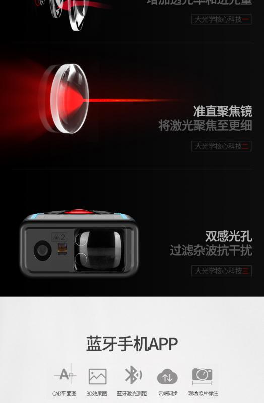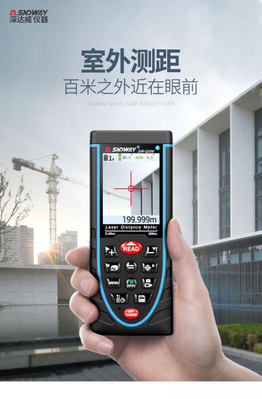 特點:Q200智能測距儀不僅體積小、重量輕,且帶有語音播報功能,可連接藍牙手機APP,具有16GB海量內存,四倍變焦攝像頭,對于室外測量可使用攝像功能精準定位,能快速準確地直接顯示目標距離。另外儀器還具備多種測量功能,可以用于面積、體積、勾股、三角面積和基準等測量,是短程精度精密測量以及房屋建筑面積測量中最新型的長度計量標準器具。