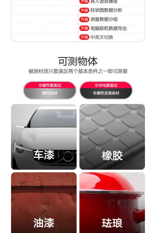 涂層測厚儀可無損地測量磁性金屬基體(如鐵和硬磁性鋼等)上非磁性涂層的厚度(如鋁、鉻、銅、琺瑯、橡膠、油漆等) ,