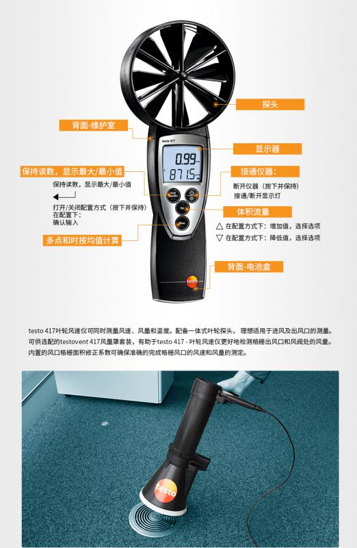 testo 417葉輪風速儀適用于進風及出風口的快速又精確的風速測量。清晰易讀的顯示屏上可顯示風速、溫度、體積流量及氣流方向。該風速計還帶時間段和多點平均值計算功能計算,按鍵即可顯示最大/最小值。