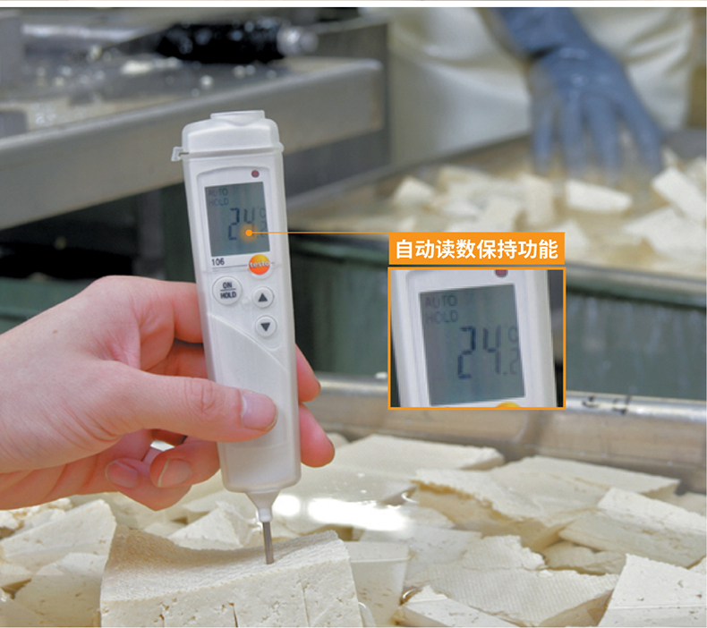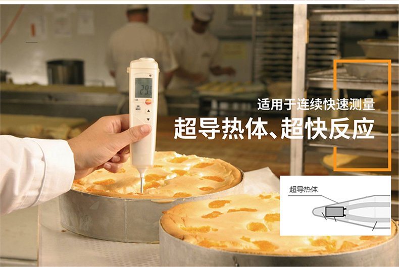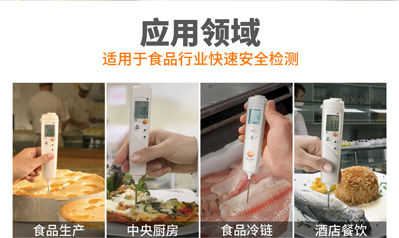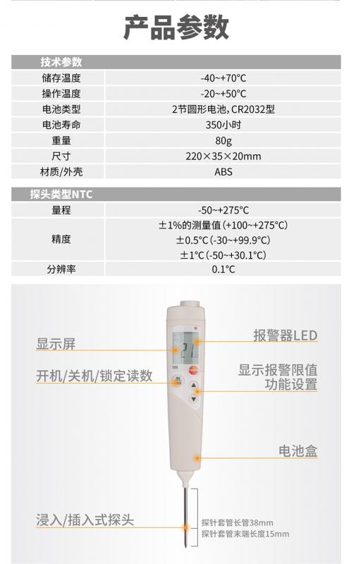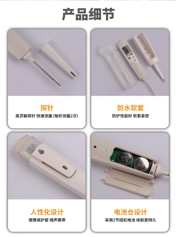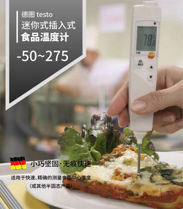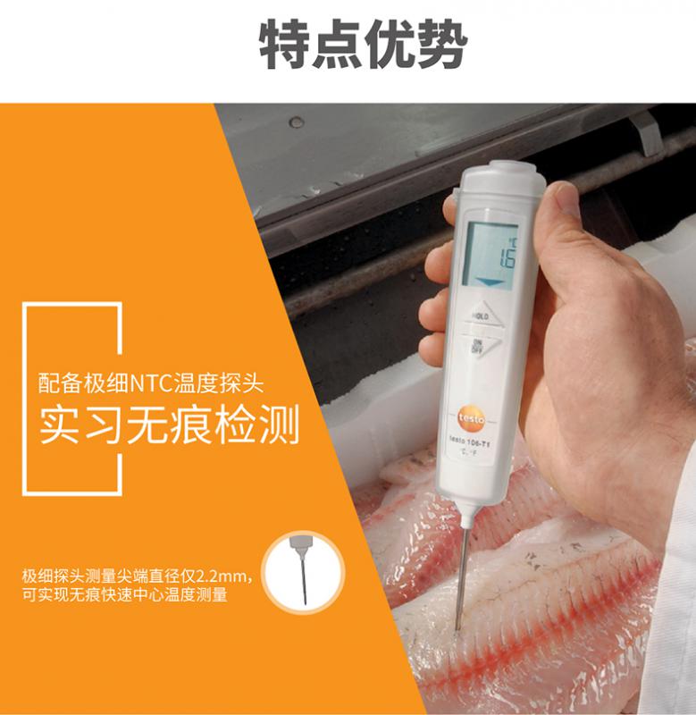 testo106迷你插入式食品溫度計,適用于快速、精確的測量食品中心溫度(或其他半固態產品),配備極細NTC溫度探頭,尖端直徑僅2.2mm,可實現無痕快速中心溫度測量,儀器帶有防水保護套,人性化設計,測溫更方便