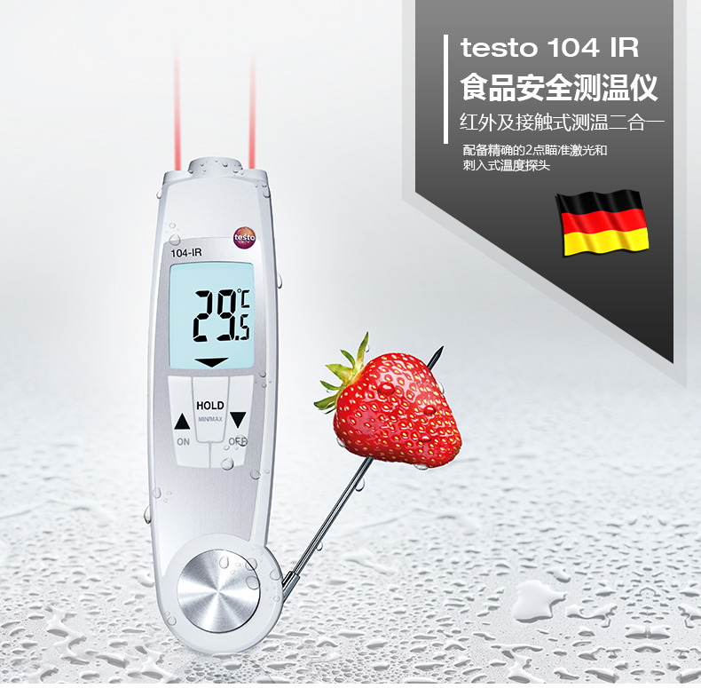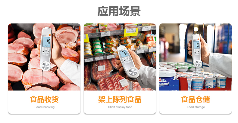 食品收貨,架上陳列食品,食品倉(cāng)儲(chǔ):testo 104-IR食品安全測(cè)溫儀為您忙碌的食品日常安全檢查工作提供快速準(zhǔn)確的溫度測(cè)量。適用于食品業(yè),餐館以及食品零售業(yè)。