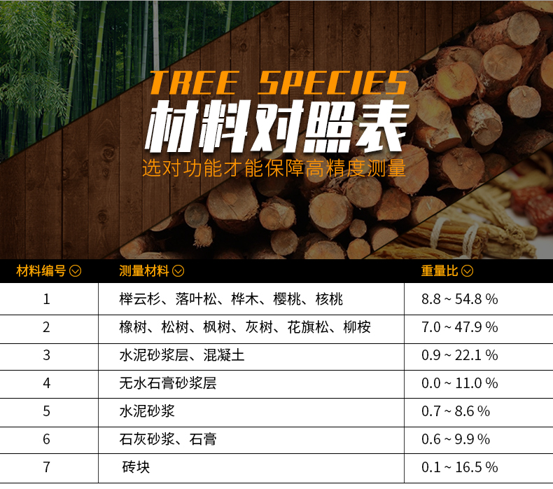 8.8~54.8%重量比;櫸云杉、落葉松、樺木、櫻桃、核桃 7.0~47.9%重量比;橡樹、松樹、楓樹、灰樹、花旗松、柳桉 0.9~22.1%重量比;水泥砂漿層、混凝土 0.0~1 1.0%重量比;無水石膏砂漿層 0.7~8.6%重量比;水泥砂漿 0.6~9.9%重量比;石灰砂漿、石膏 0.1~16.5%重量比;磚塊 |