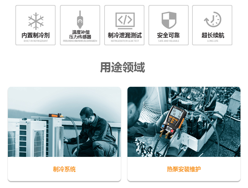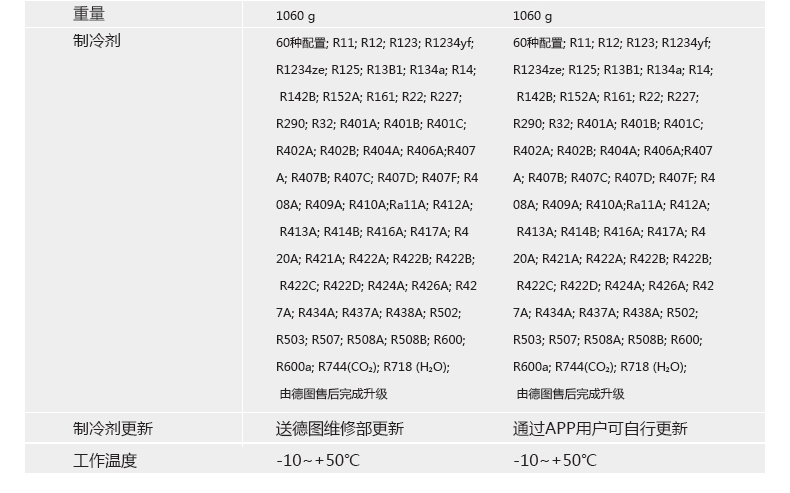 R114; R12; R123; R1233zd; R1234yf (顯示:T8 ( testo 557),客戶可自行通過"EasyKool" 軟件更新制冷劑; R1234ze; R124; R125; R13; R134a; R22;R23; R290; R32; R401A; R401B; R402A; R402B; R404A; R407A; R407C; R407F; R407H; R408A; R409A; R410A; R414B; R41 6A; R420A; R421A; R421B;R422B; R422C; R422D; R424A; R427A; R434A; R437A; R438A; R442A; R444B; R448A; R449A; R450A; R452A; R452B; R453a; R454A; R454B; R454C;R455A; R458A; R500; R502; R503; R507; R513A; R600a; R718 (H2O); R744(COz)