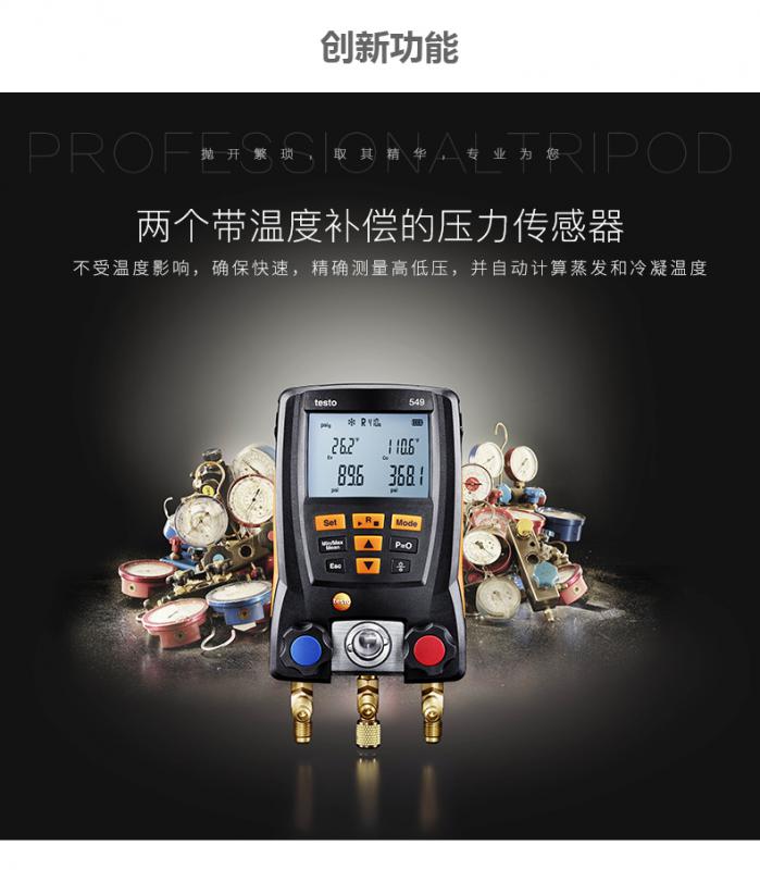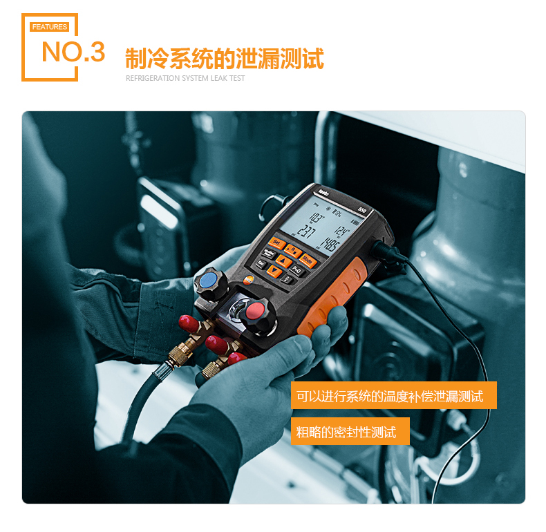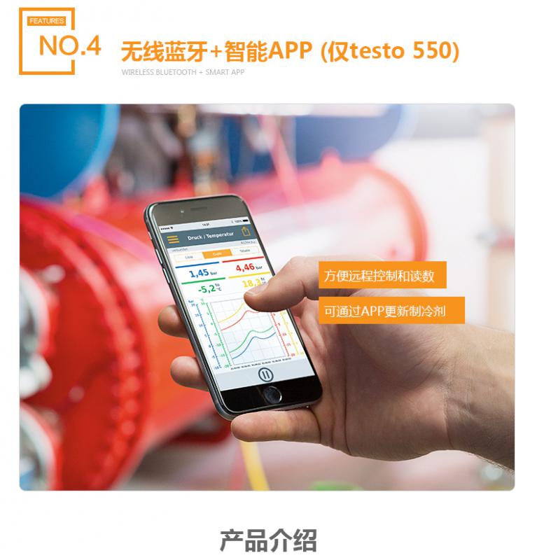 testo 557 新增藍牙功能連接智能 APP,用戶可在智能設備上讀取及記錄時間段內測量數據,并能生成測量報告并發送。制冷劑可從收藏夾中或在 APP 里快速選擇,制冷劑列表在 APP 中自動更新。四通閥組集壓力、溫度測量、泄漏測試、抽真空等功能與一身。