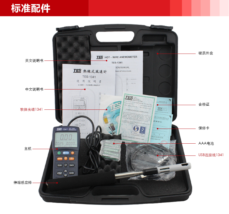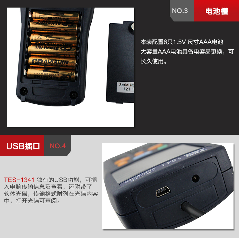 | 附件: | 攜帶盒、說明書、電池、USB線(TES-1341)、光盤軟件(TES-1341) AC電源轉換器(TES-1341) | ||