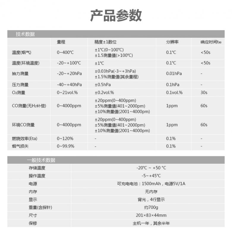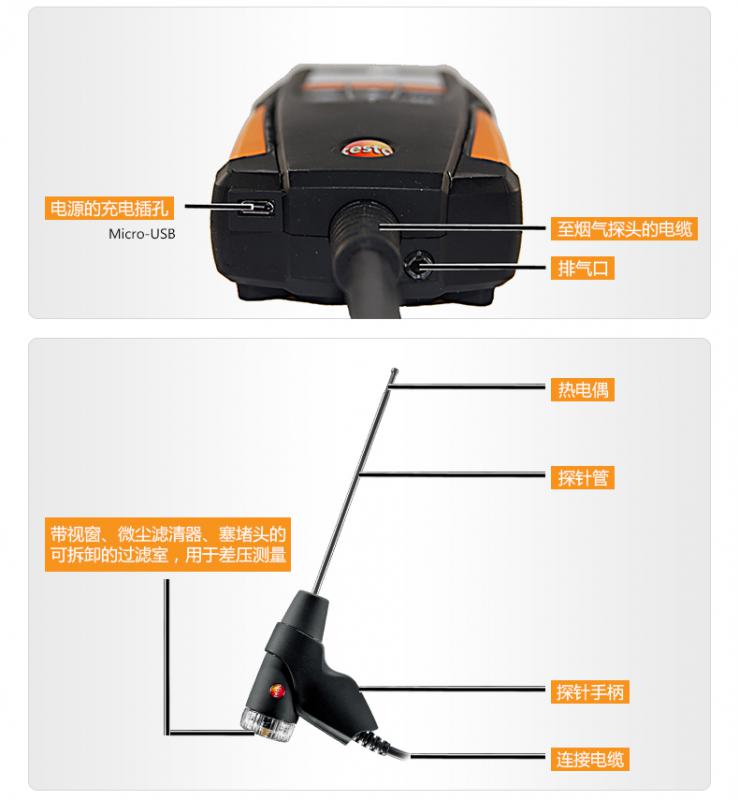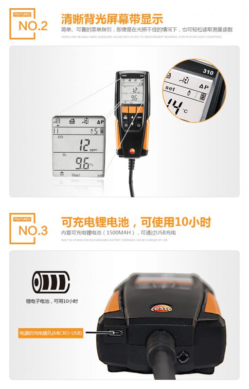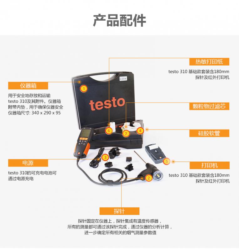 testo 310便攜式煙氣分析儀,含充電電池; O2, CO, hPa及°C的校準(zhǔn)報告;180 mm帶固定錐的煙氣探針;用于壓力測量的硅膠軟管;10個粉塵過濾芯以及儀器箱。
