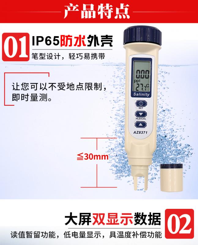 便攜式鹽度計,產(chǎn)品精度高、工作穩(wěn)定、可靠、便于攜帶。外形設(shè)計新穎美觀,產(chǎn)品設(shè)計更具有專業(yè)性,它能測量溶液的PH值和顯示被測液體的溫度。