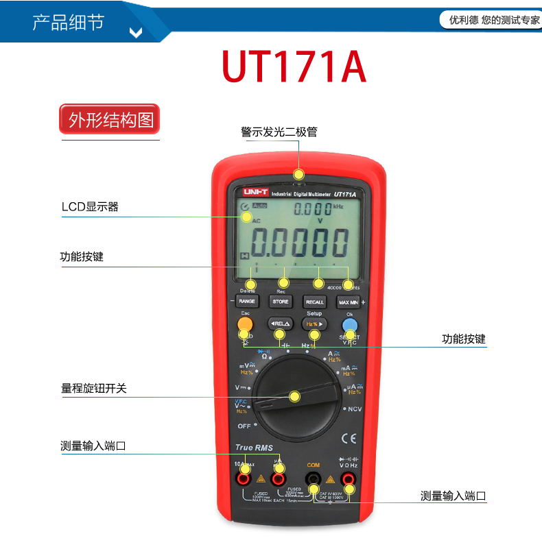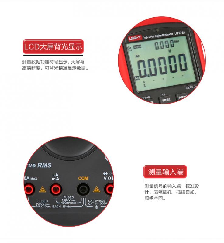 UT171系列工業級檢驗型數字萬用表,可對大多數工業問題進行故障排查。同時該系列儀表具有4-20mA回路、AC+DC、nS電導、可編程方波輸出, VFC變頻等測量功能。