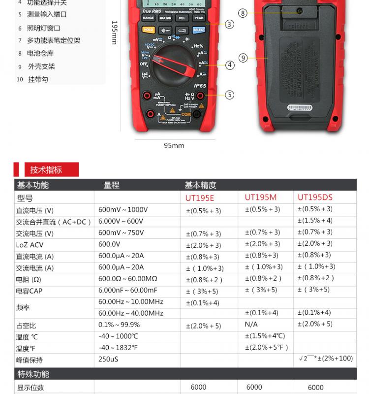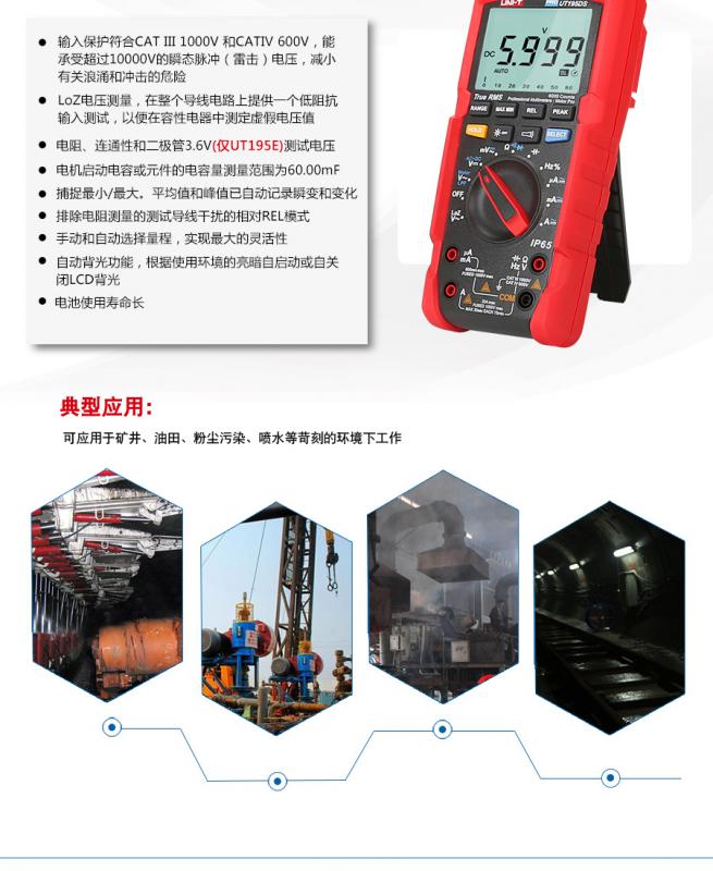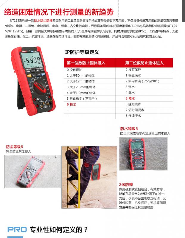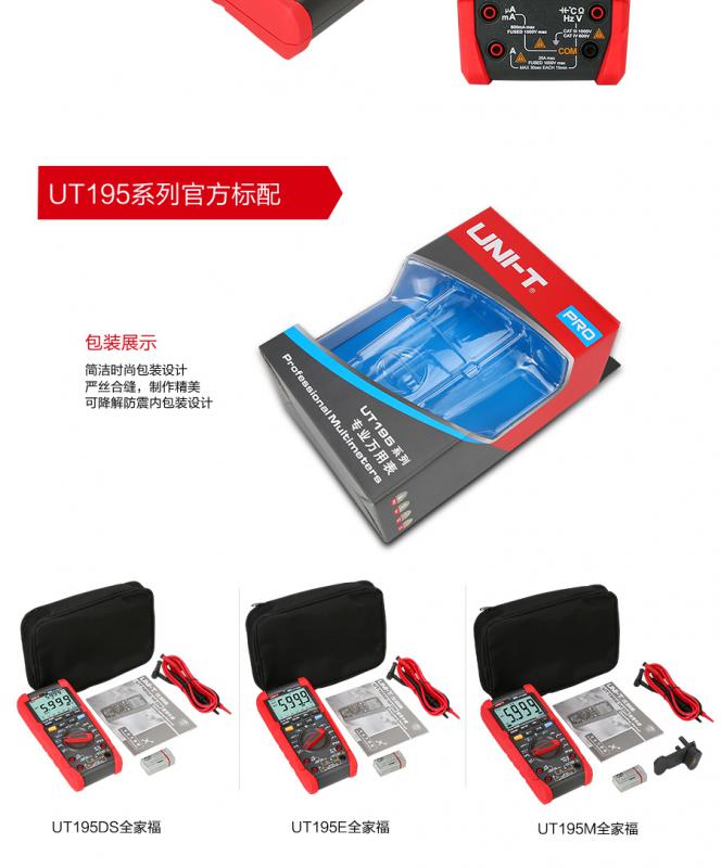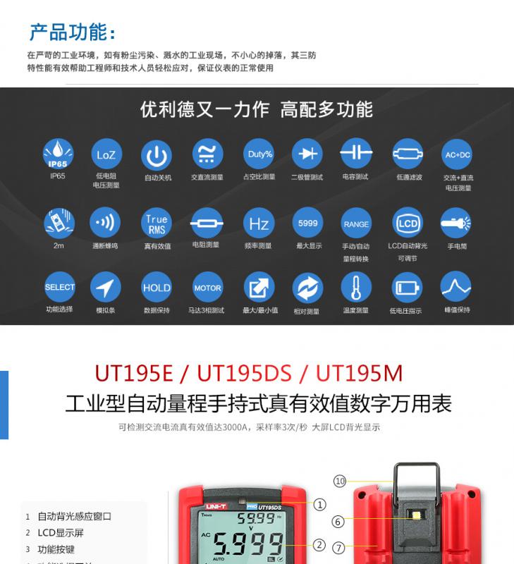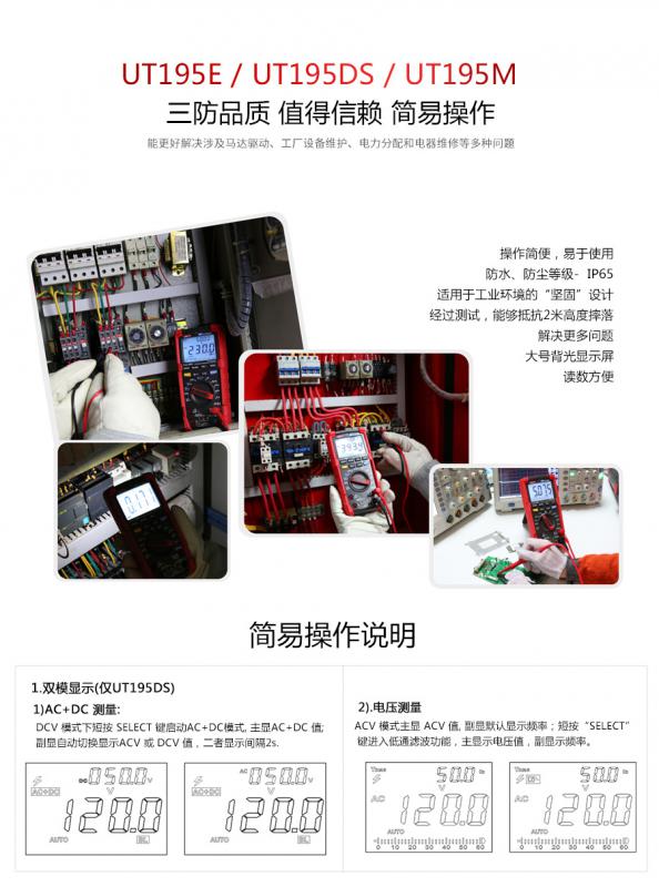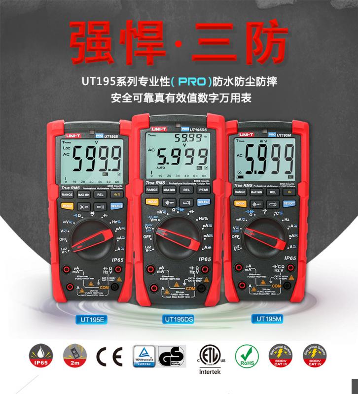 UT195DS產品是一款功能齊全、高品質、高可靠性、高安全性、三防萬用表,具有防水IP65、防塵、耐摔、大屏幕多重顯示的專業萬用表;