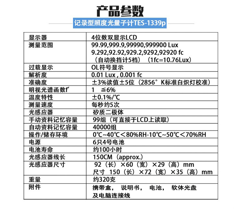 測量范圍:0.01~999900 Lux(0.001fc~92920fc),解析度:0.01Lux(0.001fc)