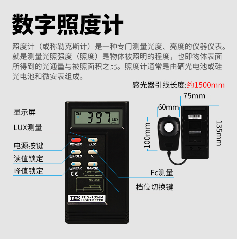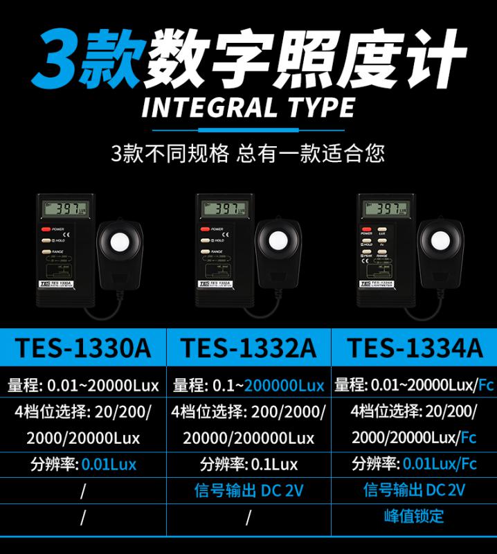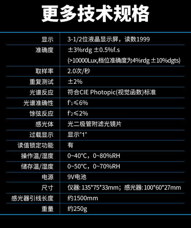 3 1/2數顯,測量范圍:0.01~20000Lux,分辨率:0.01Lux
