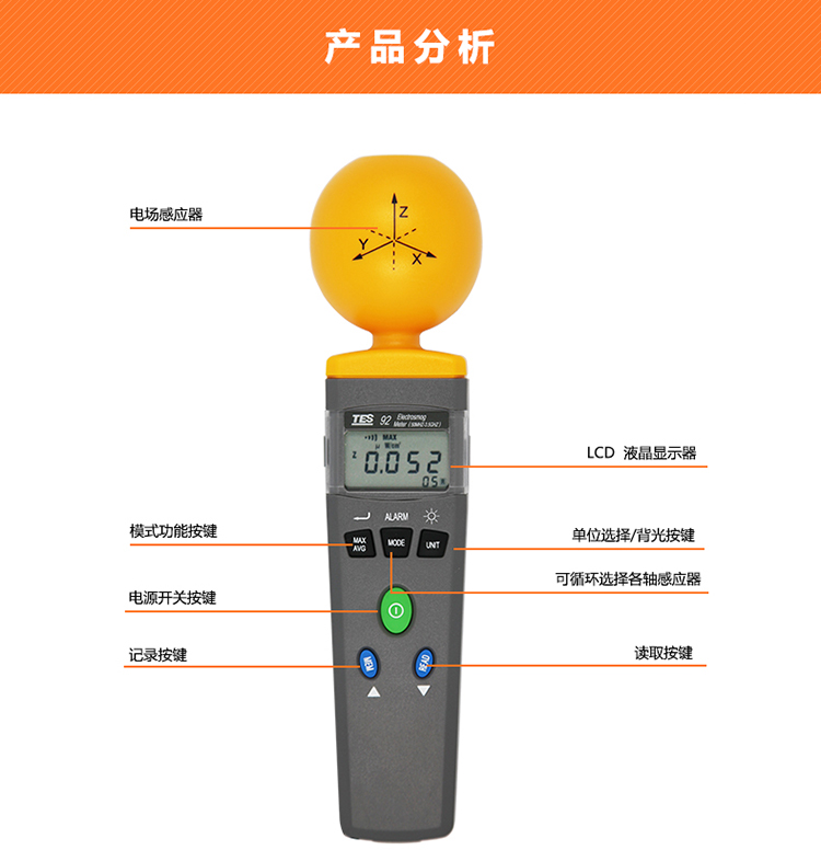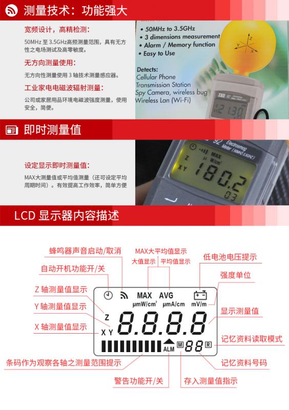 電場感應,3軸等方性,頻率范圍:50MHz~3.5GHz,過載限制:10.61mW/cm2 (200V/m)