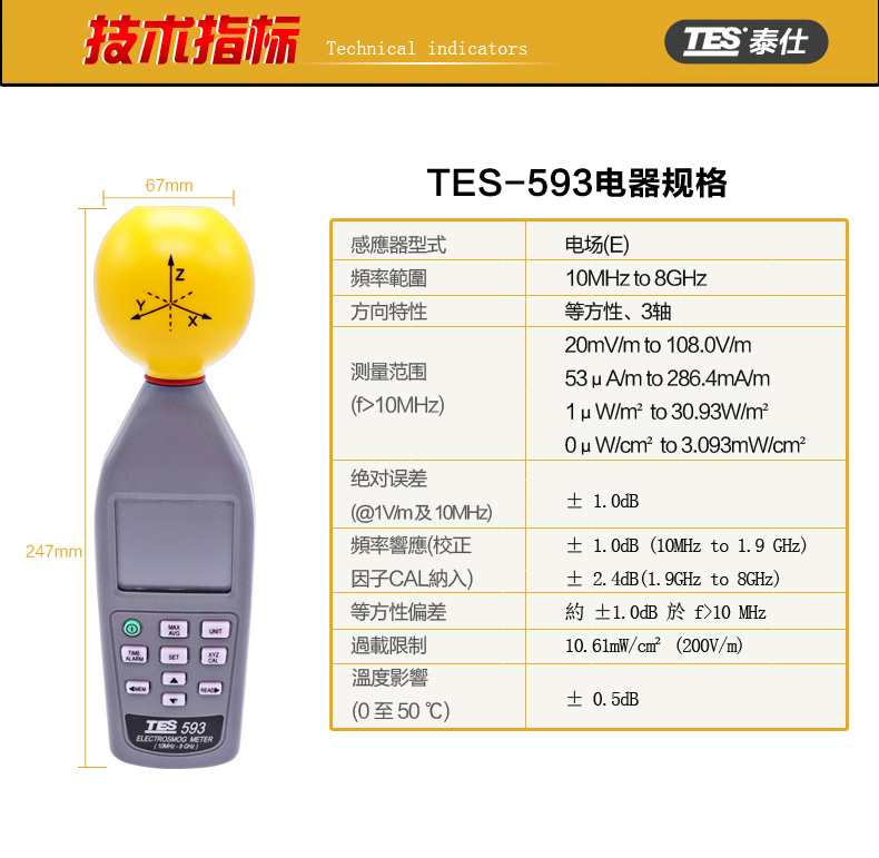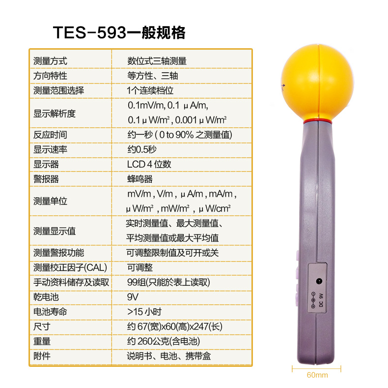 電場感應,3軸等方性,頻率范圍:10MHz~8GHz,過載限制:10.61mW/cm2(200V/m)