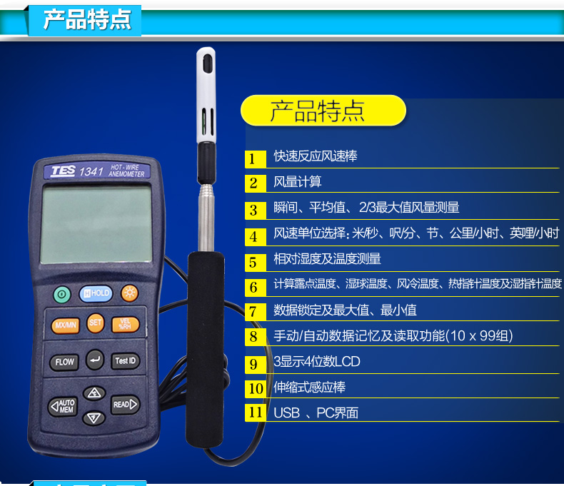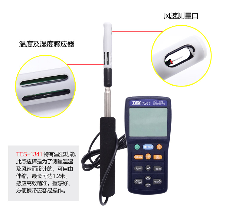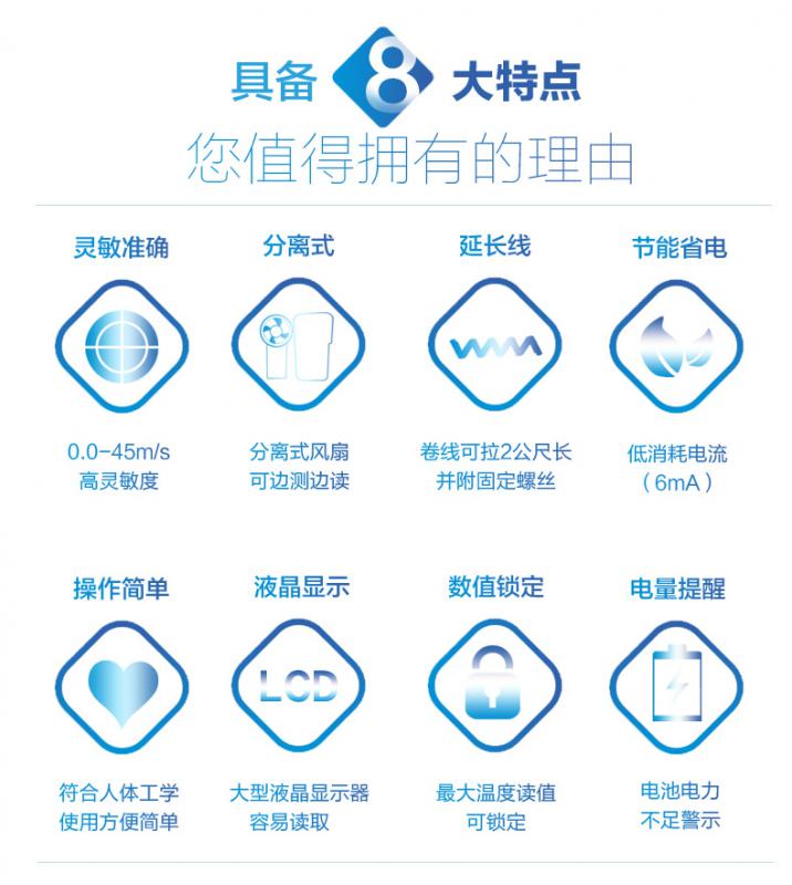 可測風(fēng)速,測量范圍:0.3~45m/s,分辨率:0.1