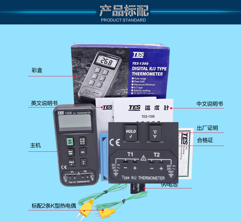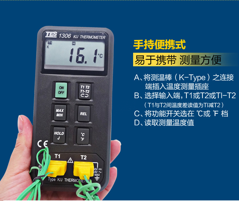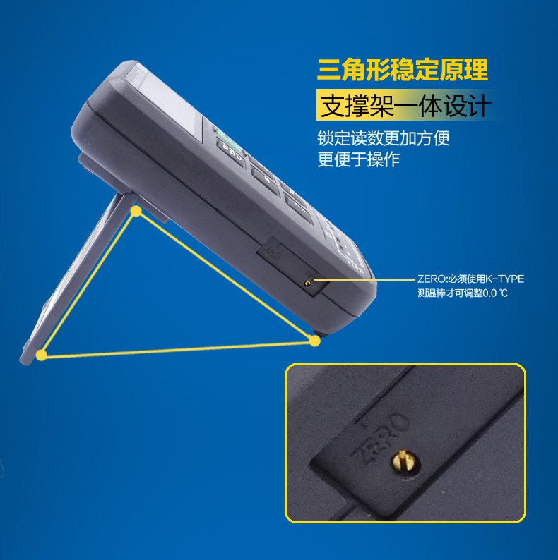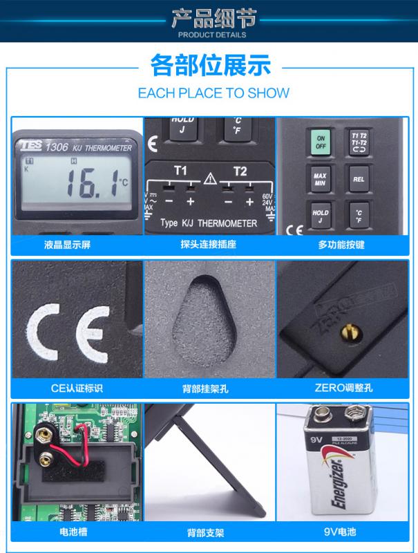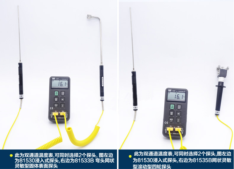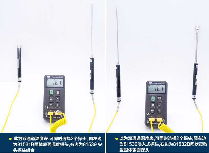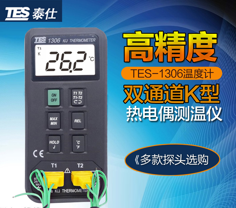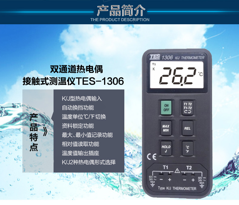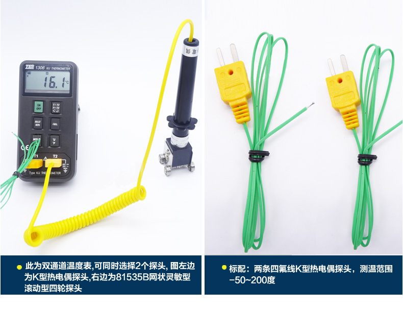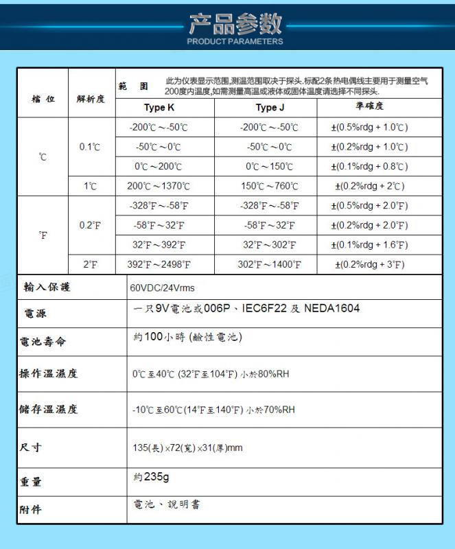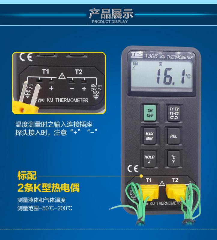 儀器自身測量范圍:-200~1370℃,分辨率:0.1℃,K/J2種熱電偶可選,最大值最小值記錄功能