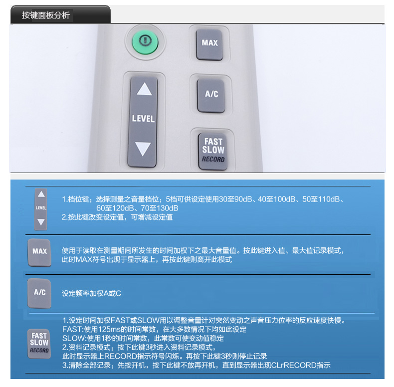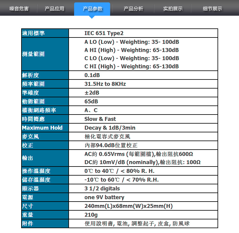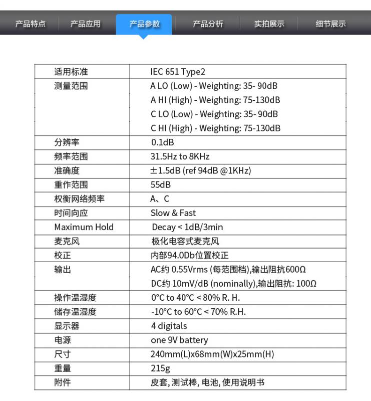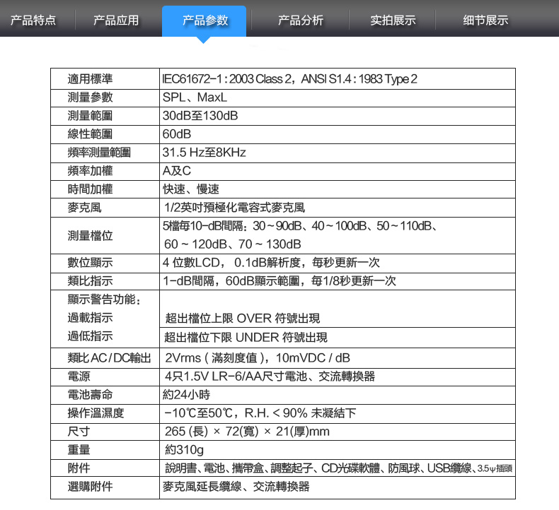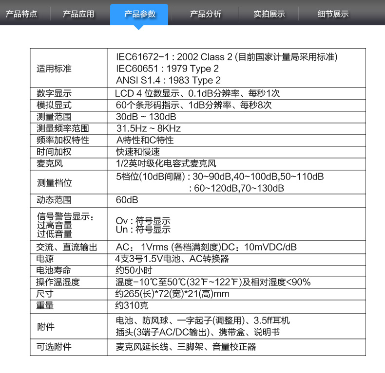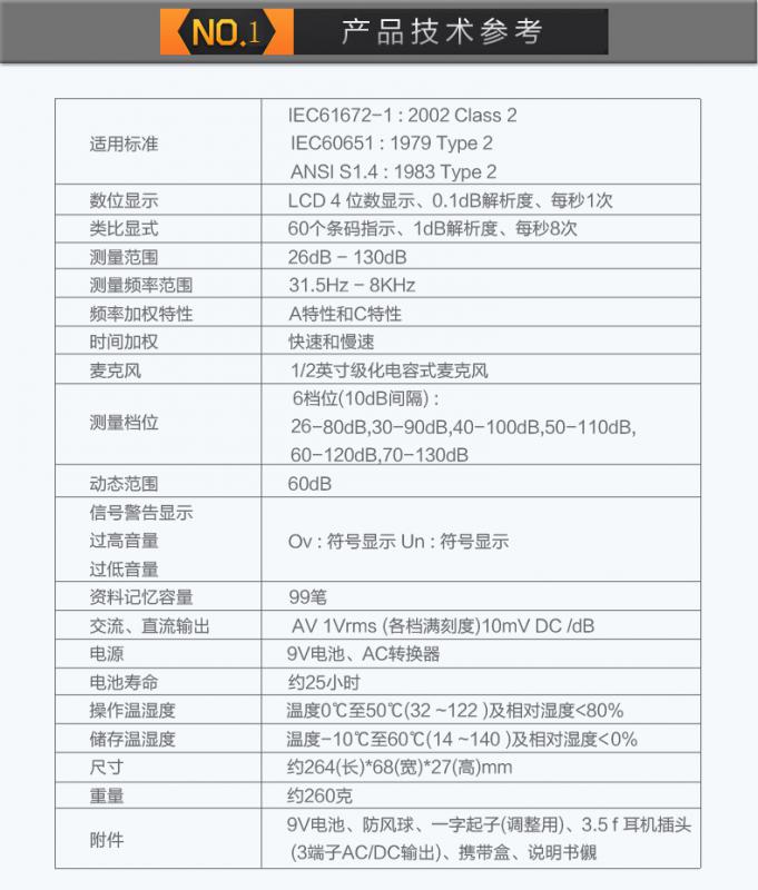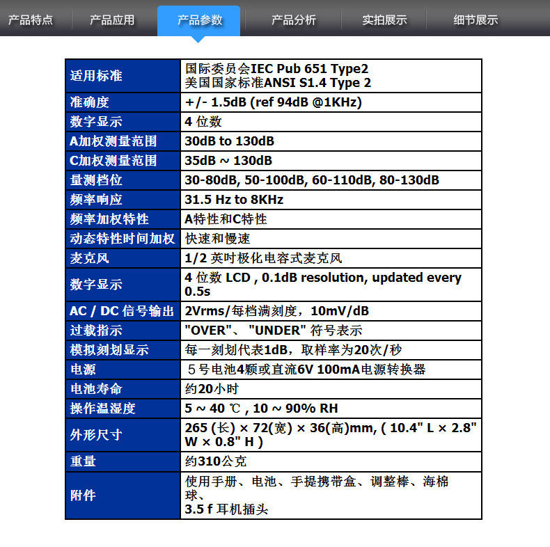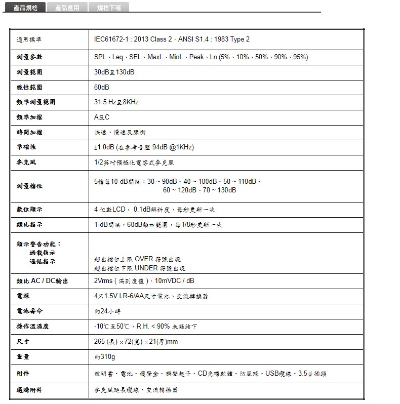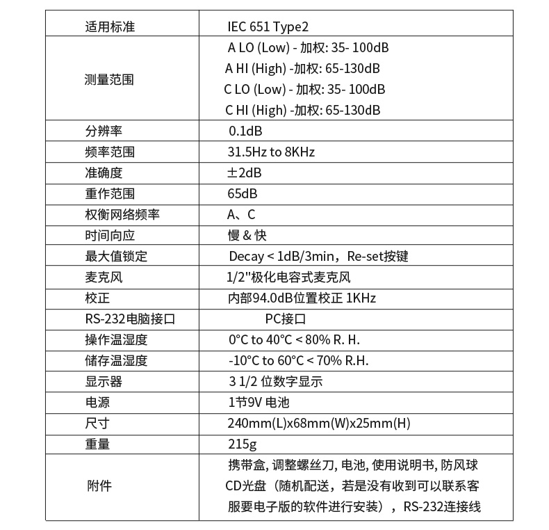 量程:30~130dB,分辨率:0.1dB,準確度:±1.5dB