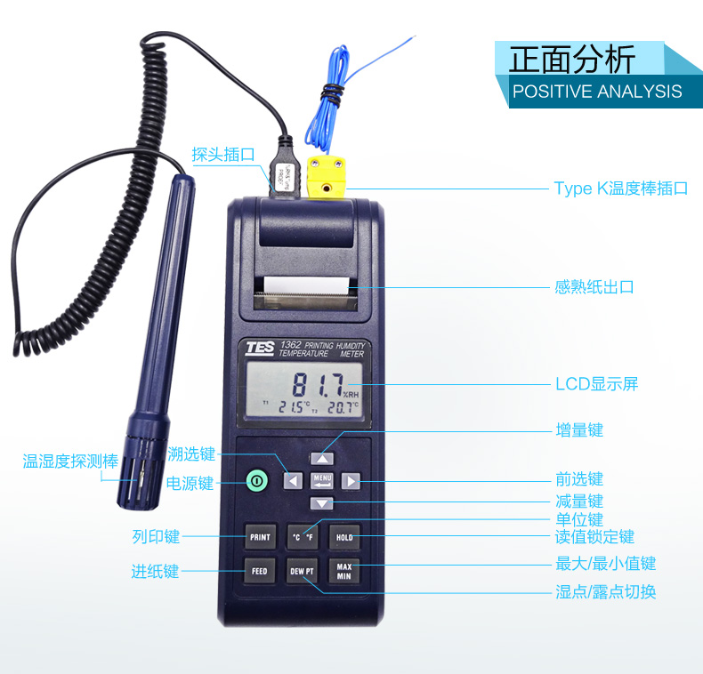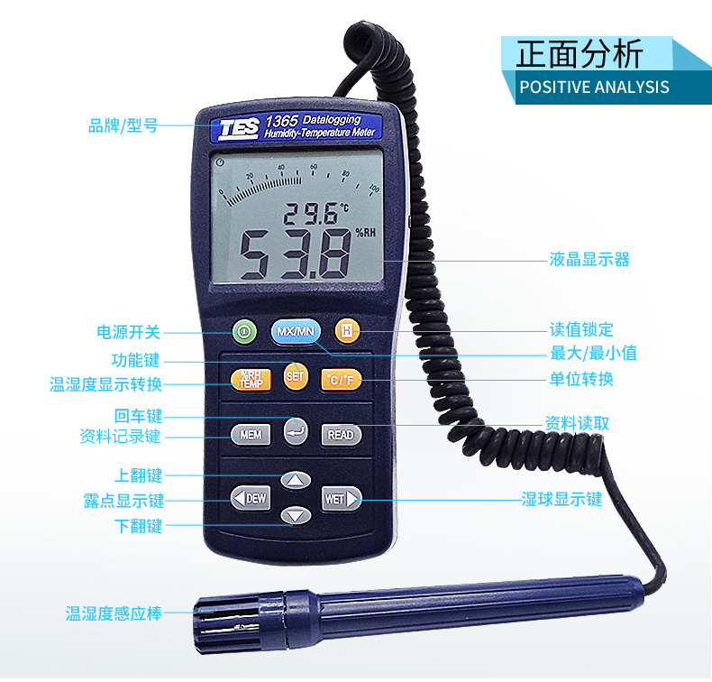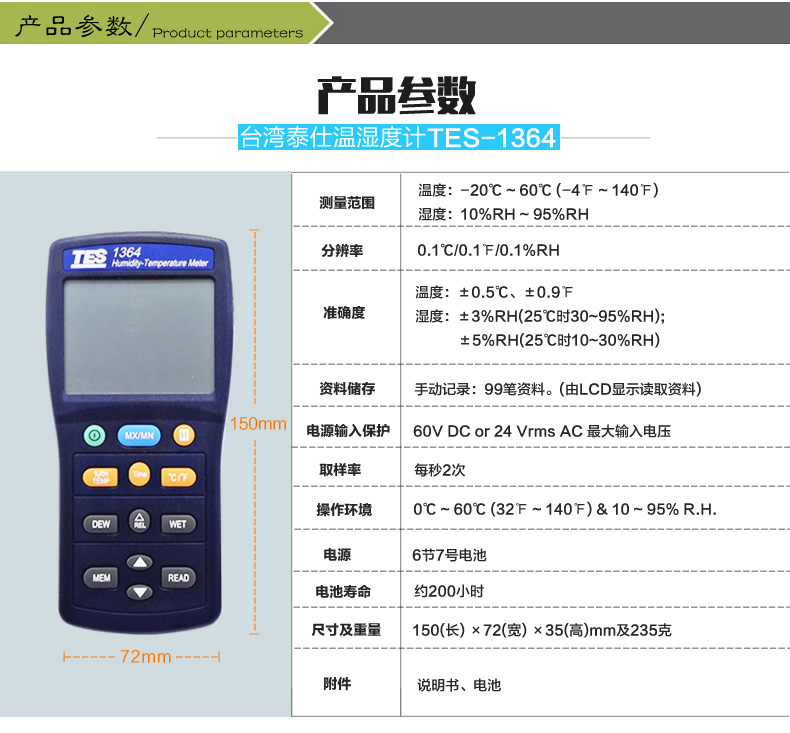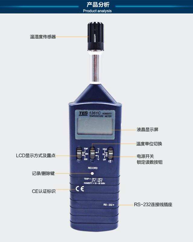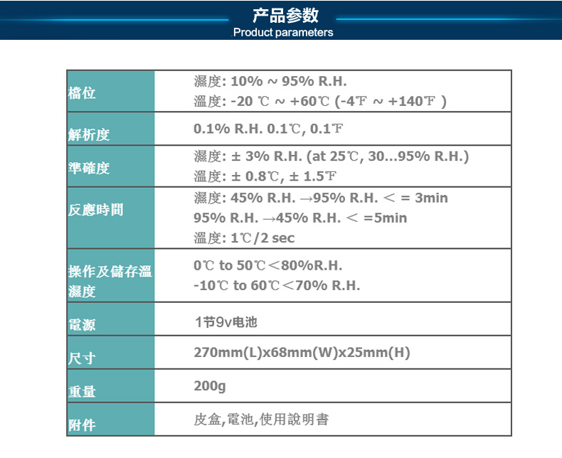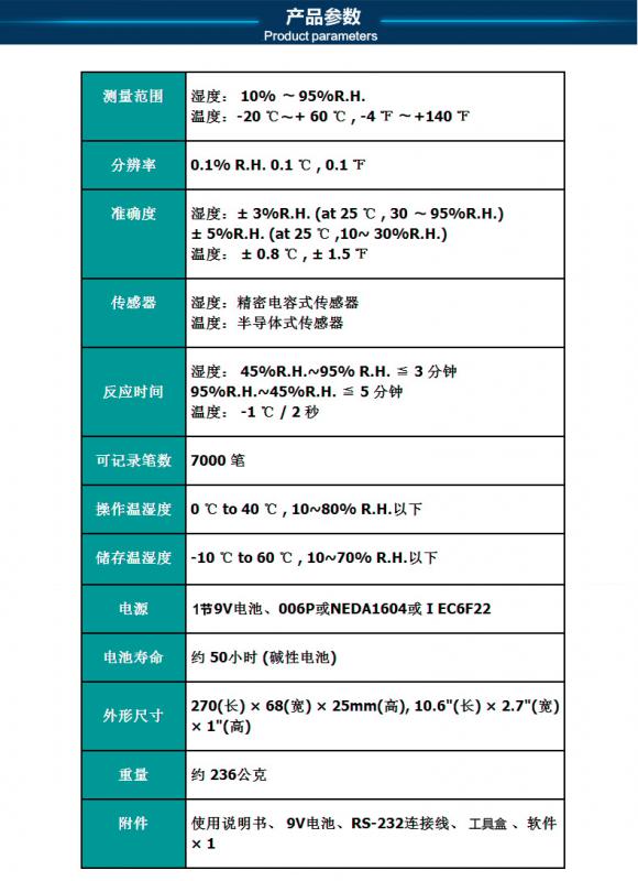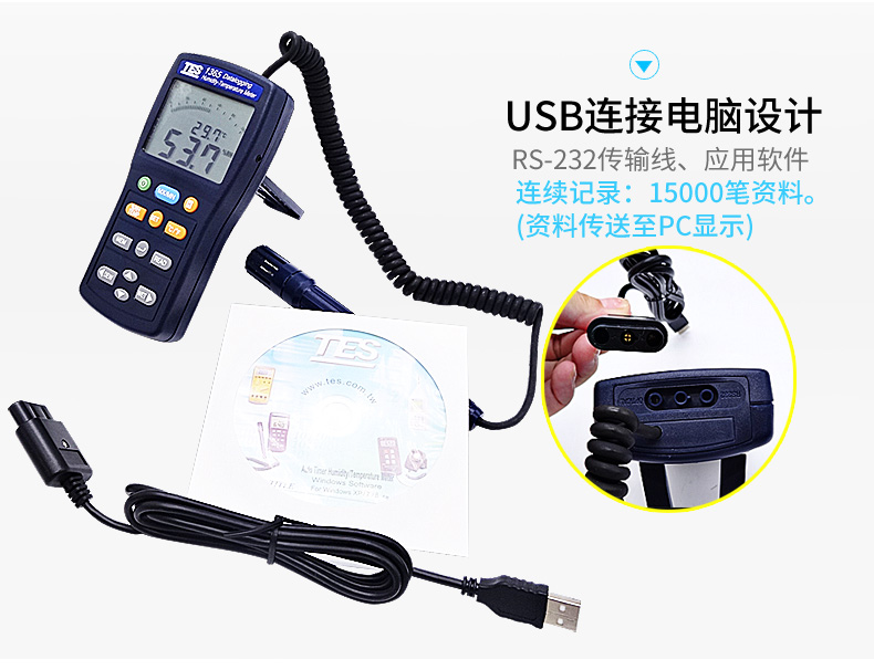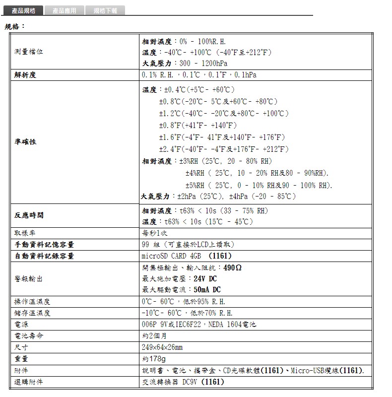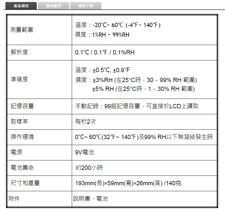 濕度:10% ~ 95%R.H. 溫度: -20℃~60℃ USB連接電腦 雙顯示LCD含模擬刻度指示。 (同時顯示溫度、濕度)