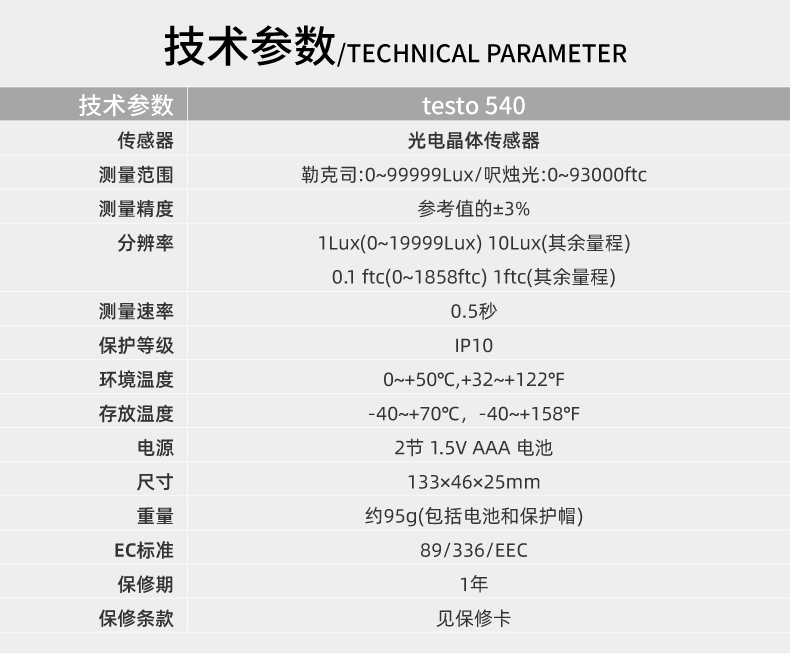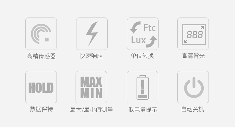 | 分辨率 | 1 Lux (0 ~ 19999 Lux) |