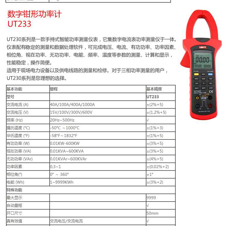 交流電流:40A/100A/400A/1000A;交流電壓:15V/100V/300V/600V;頻率:20Hz~500Hz;電能:1~9999KWh