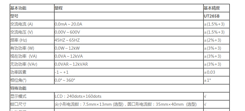 交流電流:0.0mA~20.0A,交流電壓:0.00V~600V,頻率:45Hz~65Hz,功率因素:-1~1,相位角:0.0°~360°