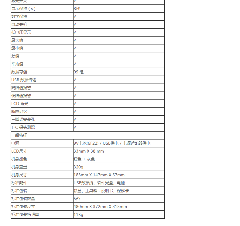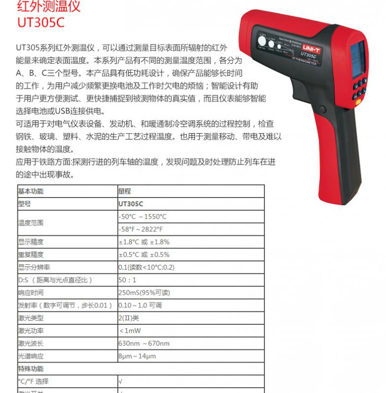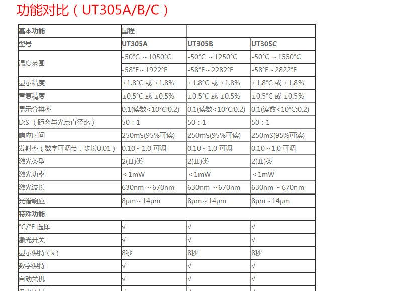 溫度范圍:-50~1550℃,顯示精度:±1.8℃/±1.8%,顯示分辨率:0.1,響應時間:250mS,發射率:0.10~1.0可調