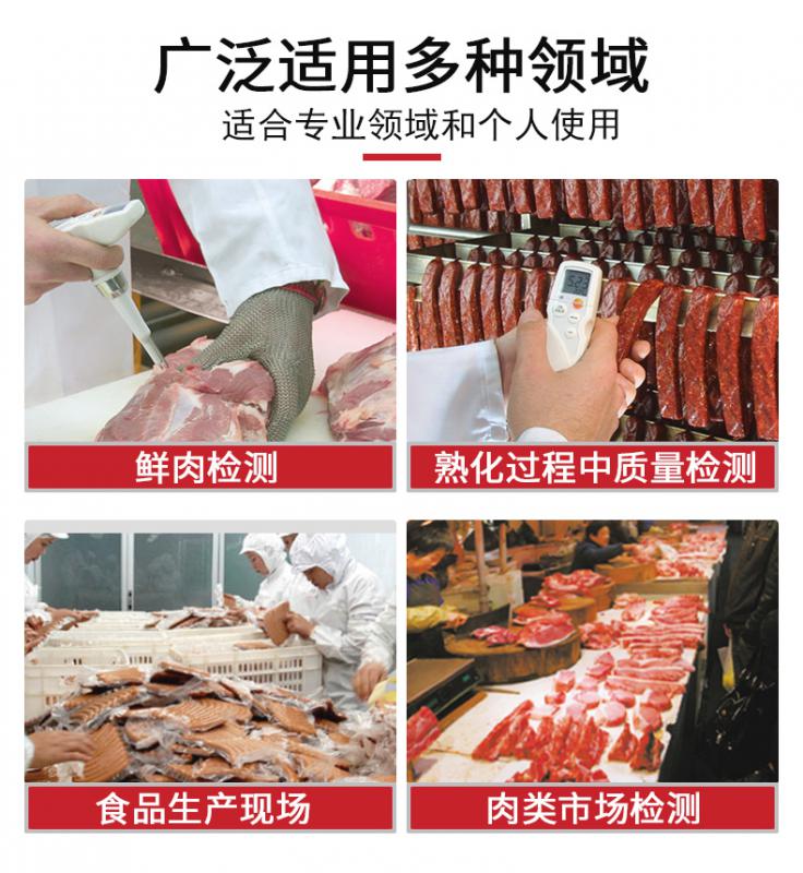 可更換探頭:標(biāo)準(zhǔn)半固態(tài)物質(zhì)探頭,可測量如肉類等物質(zhì) / 加長型200 mm探頭(選配)以及冷凍食品探頭(選配)