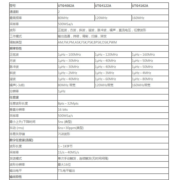 UTG4000A系列集函數(shù)發(fā)生器、任意波形發(fā)生器、脈沖發(fā)生器、諧波發(fā)生器、模擬/數(shù)字調(diào)制器、頻率計(jì)等功能于一體的多功能混合信號發(fā)生器;1μHz頻率分辨率、以及1mV的幅度分辨率,可生成精確、穩(wěn)定、純凈、低失真的輸出信號,還能提供高頻率且具有上升沿和下降沿1ns分辨數(shù)字合成的脈沖波。獨(dú)立等性能雙通道設(shè)計(jì),最高實(shí)時采樣率高達(dá)500MS/s,最大任意波長度高達(dá)32Mpts,同時具備7GB非易失波形存儲;國內(nèi)首款選配數(shù)字信號發(fā)生器輸出模塊;超寬8英寸LCD高清屏顯示,人性化的界面設(shè)計(jì)及合理的功能鍵盤布局,給用戶帶來更為人性化的使用體驗(yàn)。