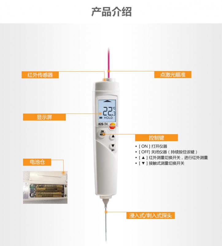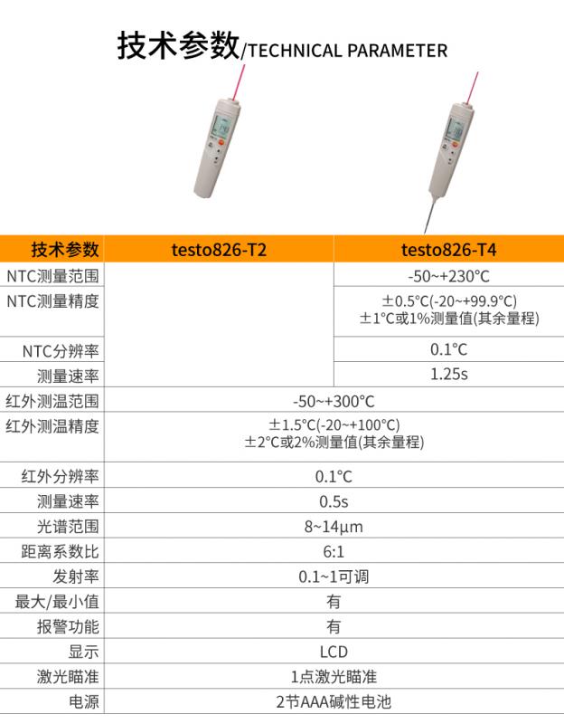 您知道testo 826-T4既有紅外測溫功能又可外接接觸式探頭 它除具備testo 826-T2的優勢外,還可外接浸入式探頭用于食品中心溫度的測量(例如酸奶或肉),當紅外測量溫度超出限值時,可用于再次確認。
