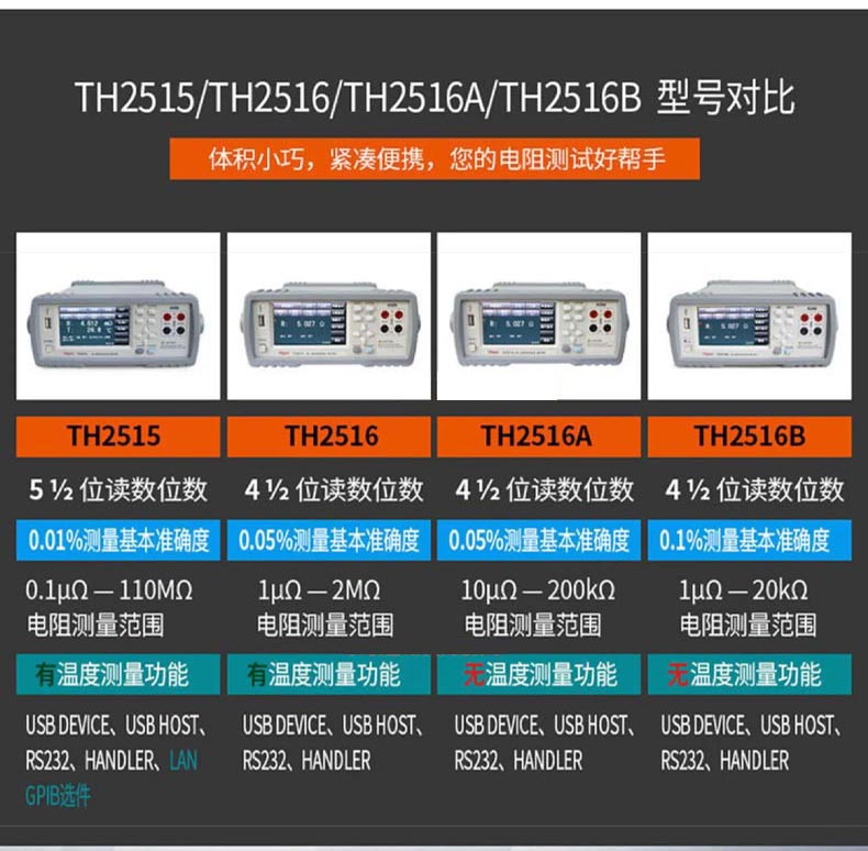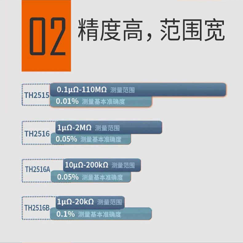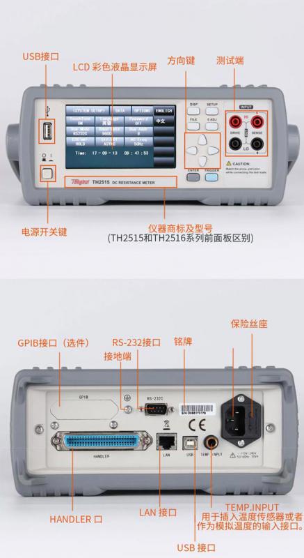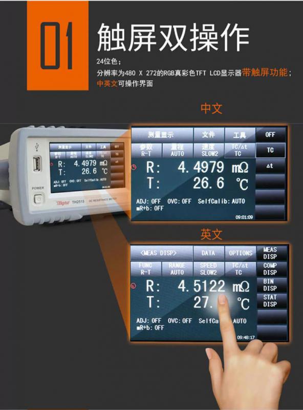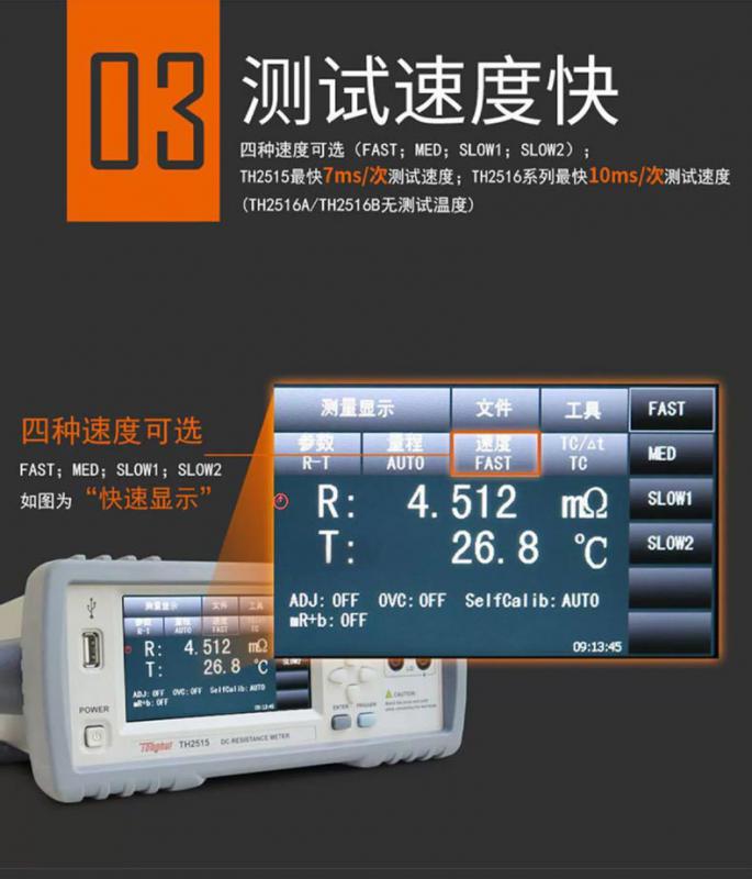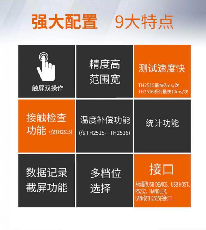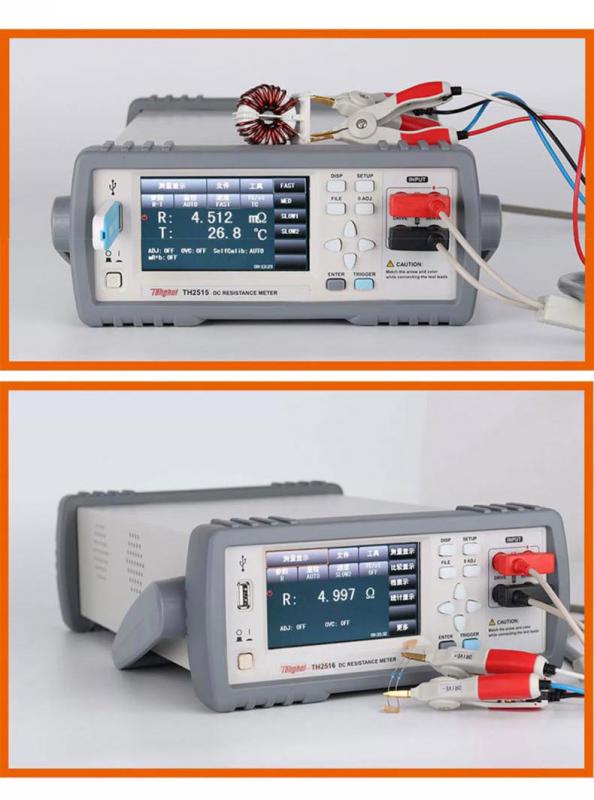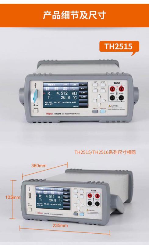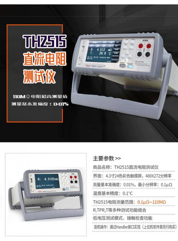 同惠電子憑借其在阻抗測試領域深厚的技術積淀和廣泛的市場調研,推出了帶觸摸功能和彩色液晶顯示的直流阻抗測試儀器--TH2515系列直流電阻測試儀。其較高的性能、便捷的操作、精美的外觀足以相較于市場上的前沿產品。TH2515系列直流電阻測試儀采用當前主流的32bits CPU和高密度SMD貼裝工藝,帶觸摸功能的24位色4.3英寸彩色液晶屏,界面清爽、操作便捷;0.01%的最高電阻測量精度及0.1uΩ最小電阻分辨率在國內首屈一指,其適用于繼電器接觸電阻、接插件接插電阻、導線電阻、印制板線路及焊孔電阻等;很好的消除了熱電對被測元件接觸的影響而引起的潛在誤差;溫度補償和溫度轉換功能免除環境溫度對測試工作的影響;失調電壓補償功能能夠有效消除被測件的自身的電動勢以及接觸電勢差;其超高速的測試速度以及通過handler接口可以輸出10檔不同邊界的比較結果信號,便于生產線上的自動化操作。TH2515系列提供了幾乎所有主流的接口功能,可方便的與PC進行數據通訊和遠程控制。